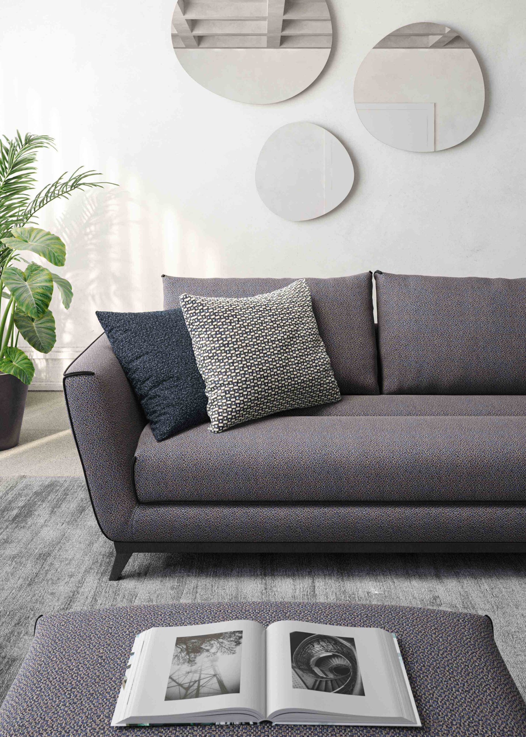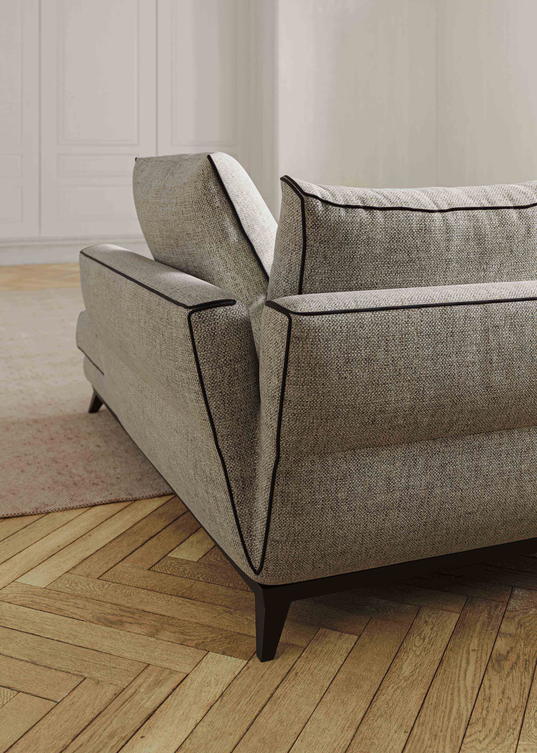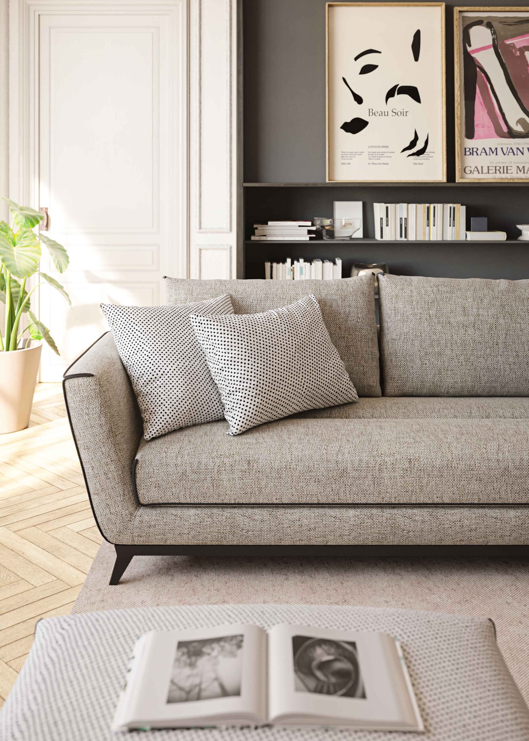 The minimalist mood of the Perfect Dream sofa is enriched by the use of refined materials. Each component of the sofa is crafted with attention to detail, using high-quality fabrics that offer a feeling of softness and comfort. The tailored details, such as the precise stitching and contrasting piping, highlight the brand’s attention to craftsmanship and quality, making each piece unique and precious.