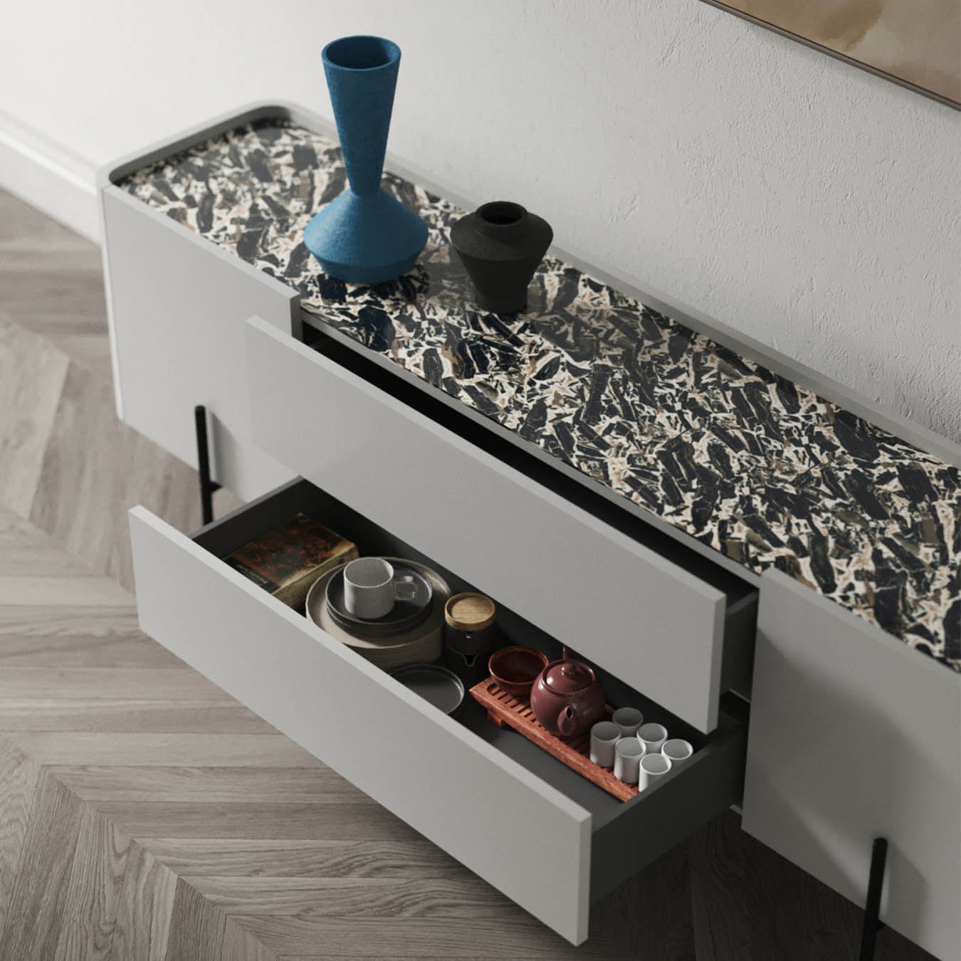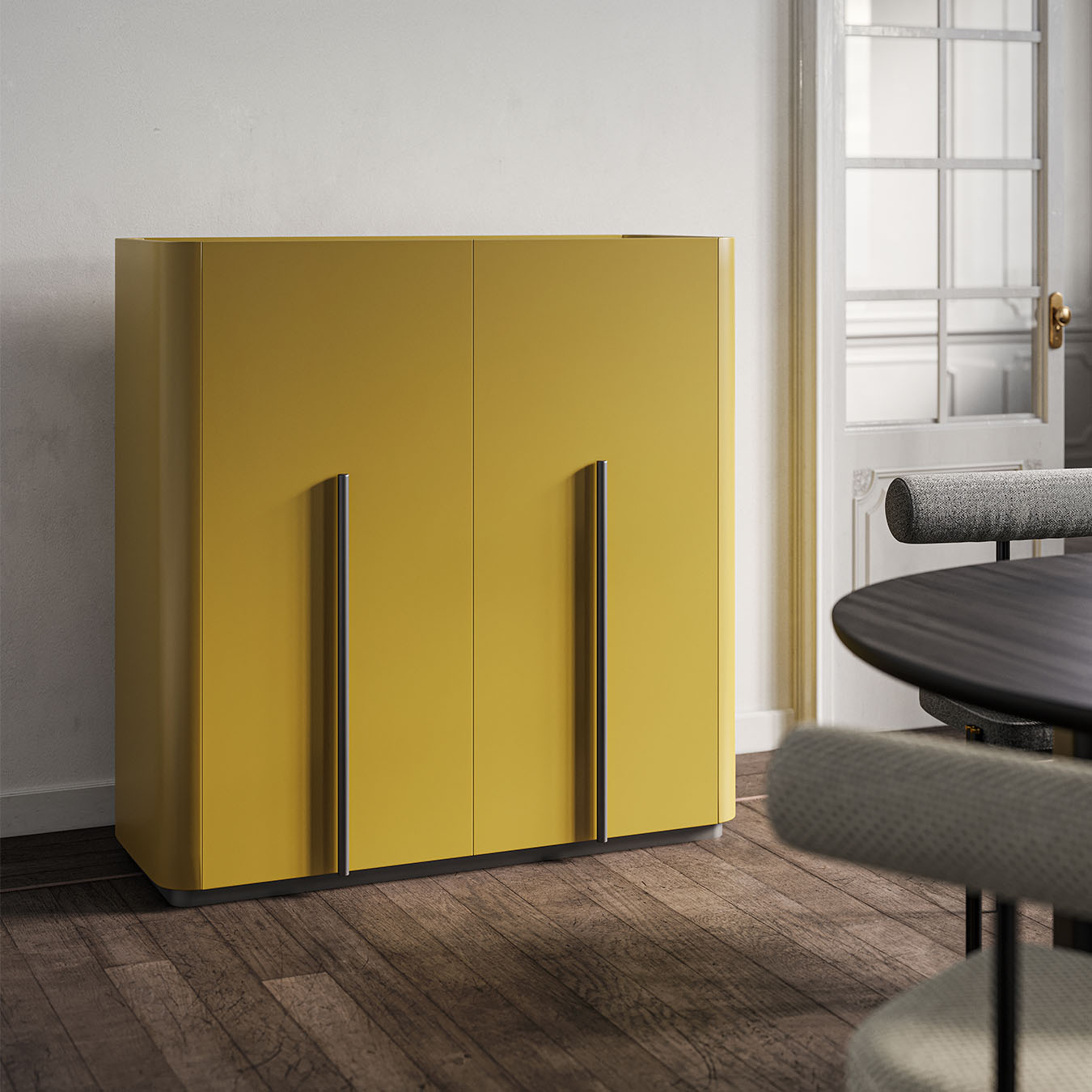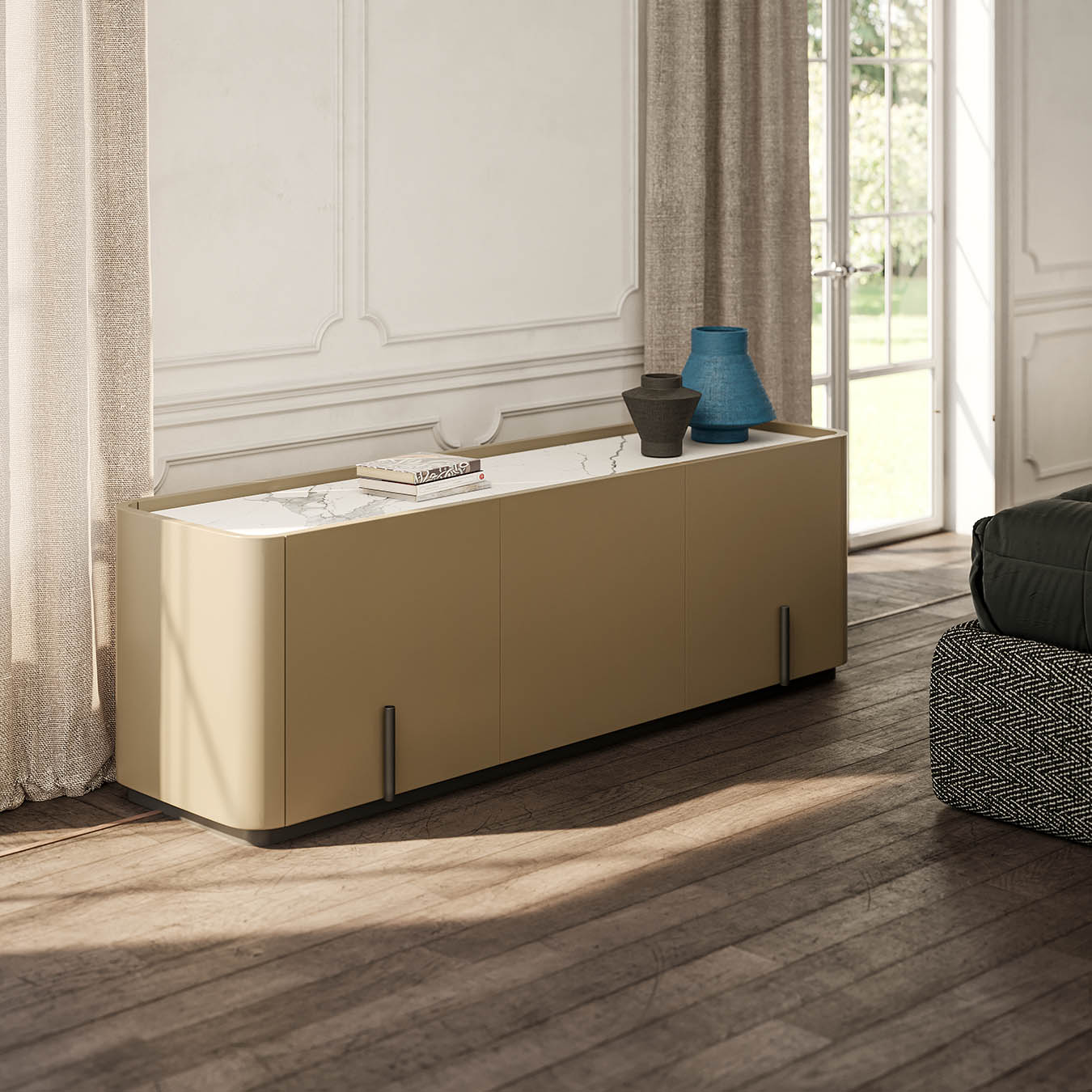 Pillier è disponibile in due versioni: una madia e un cabinet. Entrambe le varianti condividono la stessa forma pura e irregolare, ma differiscono per le dimensioni e l’altezza, adattandosi così a diverse esigenze di arredamento. La madia, grazie alla sua linea più bassa e allungata, è perfetta per essere collocata lungo una parete del soggiorno o come separatore tra diversi ambienti. Il cabinet, invece, con la sua altezza più pronunciata, è ideale per organizzare e contenere oggetti di vario tipo, mantenendo sempre un aspetto ordinato e sofisticato.